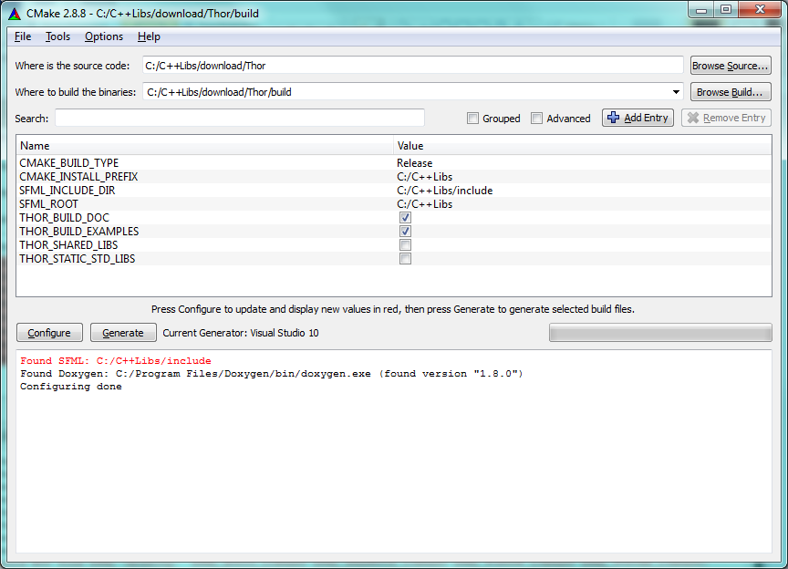 Press "Configure" and choose the options according to your needs. In this example, C:/C++Libs is the path where all the include, lib, bin folders are located. Thus, this is the SFML_ROOT directory. Because I want Thor's include and binary files to be installed in this directory, too, the CMAKE_INSTALL_DIR contains the same path. The CMake window now looks like this: